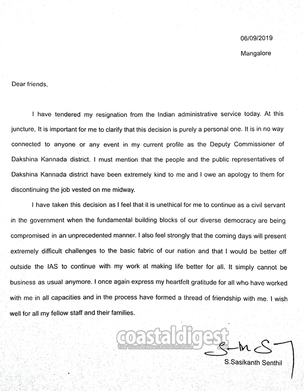 Mangaluru, Sept 6: In a surprise move, Sasikanth Senthil, the Deputy Commissioner of Dakshina Kannada today tendered his resignation from the Indian Administrative Service citing personal reasons.
