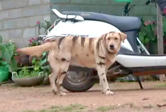 Srikanth Gowda, a farmer from Naluru village in Shivamogga district's Thirthahalli Taluk has dyed the fur of his dog to make him look like a tiger.
