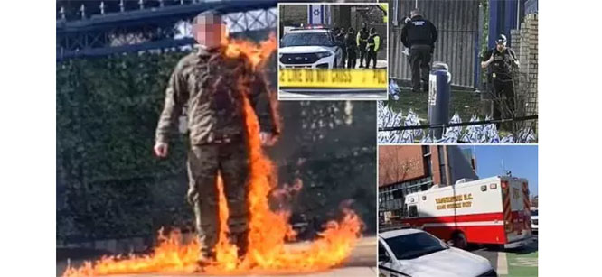 US media reported that the man livestreamed himself on Twitch, wearing fatigues and declaring he would “not be complicit in genocide” before dousing himself in liquid.