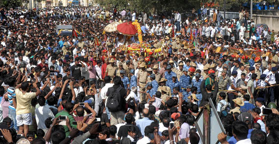 The body was brought in a flower bedecked palanquin from Amba palace to the cremation point Manuvana with five Dasara elephants and cavalry of 13 horses of the Mysore police leading the last journey of the "prince."