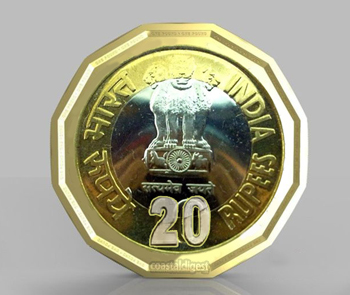 The outer ring of Rs 20 coin will be 65 percent copper, 15 percent zinc and 20 per nickel, the inner disc will be 75 percent copper, 20 percent zinc and five percent nickel.