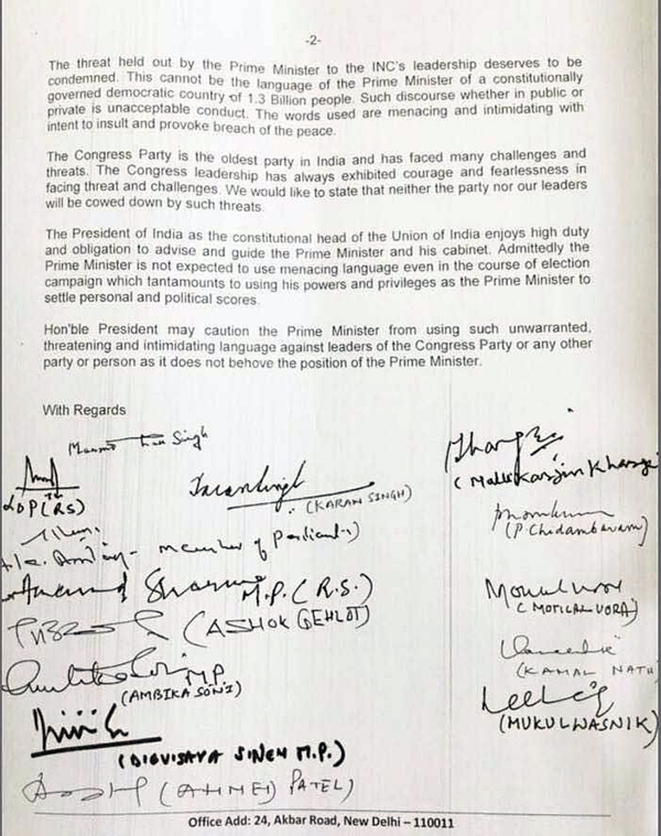 Apart from Singh, the letter was signed by Leaders of Opposition of both houses of Parliament and senior Congress leaders like P. Chidambaram, Ashok Gehlot, Ambika Soni, Mukul Wasnik, Motilal Vora, Kamal Nath and Ahmed Patel.