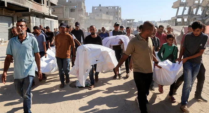 Gaza, July 4: As the humanitarian crisis deepens in the besieged Gaza Strip, Israeli airstrikes on Friday killed nearly 50 Palestinians—including civilians seeking food at aid distribution centers—according to medical sources.