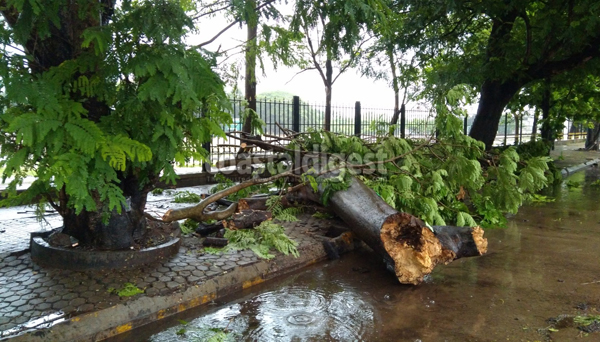 The branch fell on the portion of a metal roofing in the courtyard of the temple. The portion of the metal roofing came down along with the falling branch.