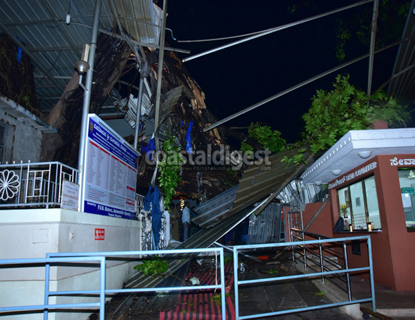 Last evening, a huge branch of a peepal tree in front of the historic Mangaladevi temple in Mangaluru fell evening resulting in injury to four persons.