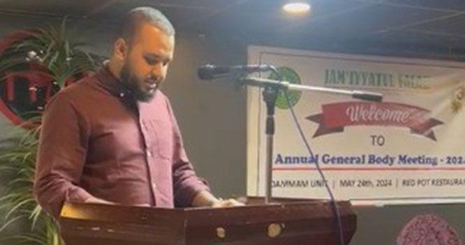 The proceedings were moderated by Mohammad Irshad, with Suneer Ahmed serving as the master of ceremonies. Distinguished guests included Abdul Salam, Kabeer K.M., Sayed Bava, Sameer Ahmed, President of JF Jubail Unit Mohammad Farook, Treasurer of JF Jubail Unit Salim Shaikh, President of Dammam Unit Br. Sharief Karkala, and NRCC Ameer Mansour Ali Ahmed was invited on the Dais.