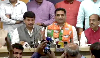 The two leaders were welcomed by BJP national vice president Shyam Jaju and Delhi unit president Manoj Tiwari at the party's office on Pant Marg.