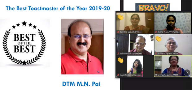 Aashitha Shetty was the anchor for the program. Chandrashekar Palekar rendered the invocation and Benzita Ferrao welcomed the gathering. Outgoing President Kavitha Kamath thanked her entire team, mentors and the club members for their support during her tenure. Outgoing Vice President-Education Mareena Seema presented the Toastmaster of the year award to Distinguished Toastmaster M. N. Pai. Jyothi Hebbar presented an elaborate Secretary’s report highlighting the club’s happenings, events and achievements during the past year 2019-20.