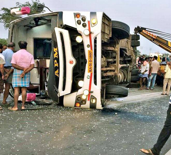 The bus was carrying 23 passengers from Kundapur to Bengaluru. According to officials, owing to the negligence of the driver, the bus overturned turtle after hitting the road-divider.
