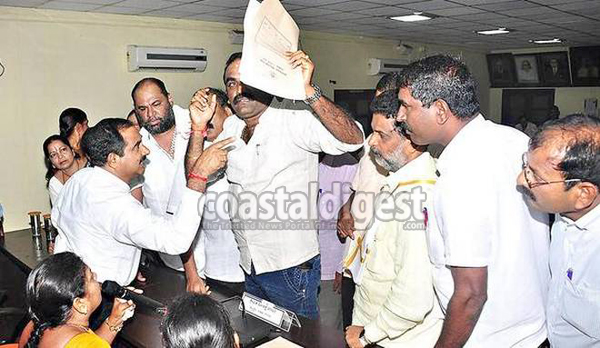 There was slogan shouting between BJP and the ruling Congress councillors. As the BJP councillors were unrelenting, Ms. Bannanje read the entire agenda amidst the din and said that it was passed with a majority and adjourned the meeting. The BJP councillors said this was wrong as they had not signed the attendance register.
